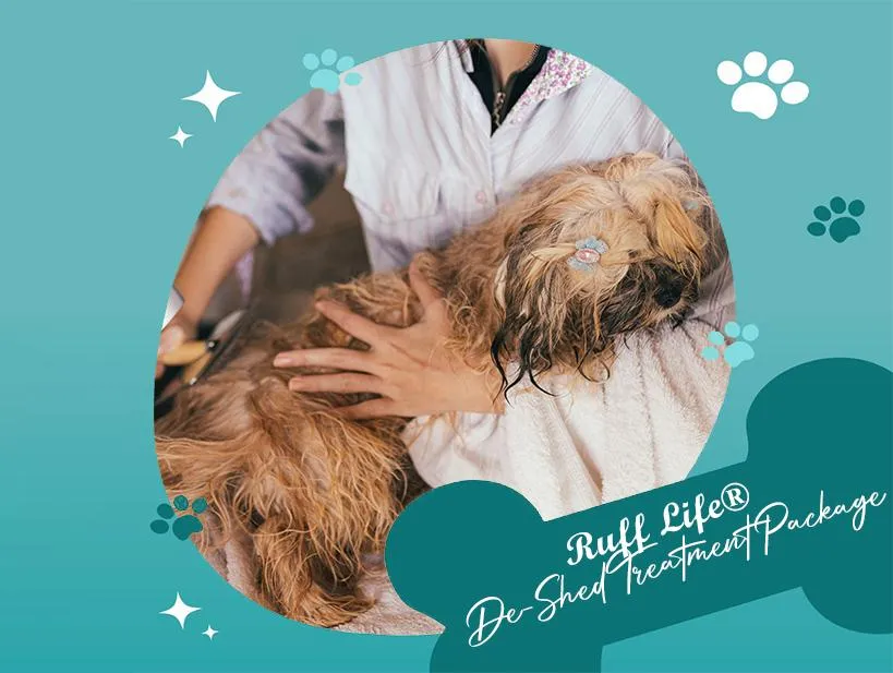 Our therapeutic system, when used on a regular basis, decreases shedding and leaves your dog's coat shiny, soft, and clean to the touch! We use Coat Handler® shampoo and conditioner. Package includes: Therapeutic deshedding bath, fluff-dry, and a thorough brush out, haircut, pads, sanitary strip, nail trim and ear cleaning.